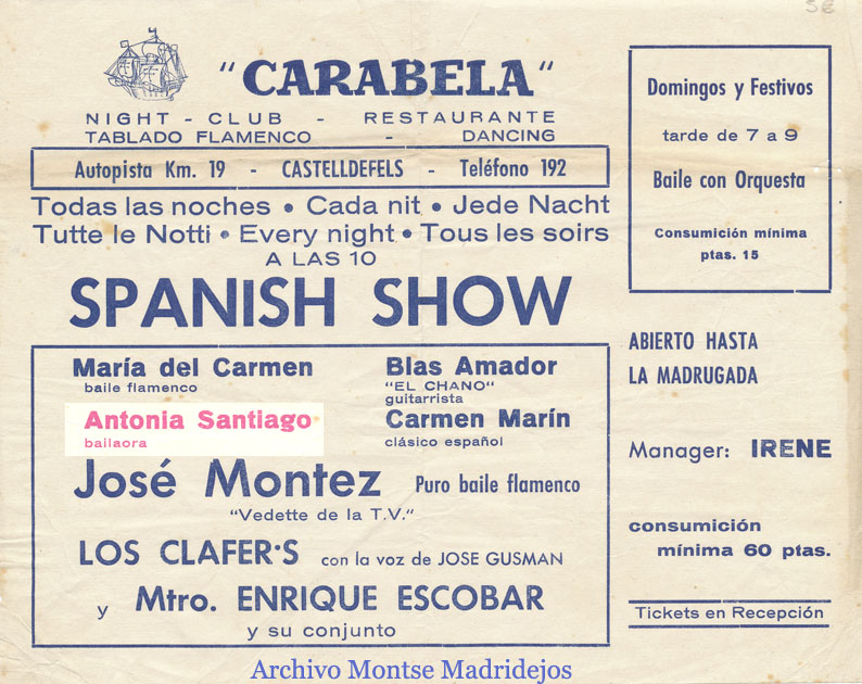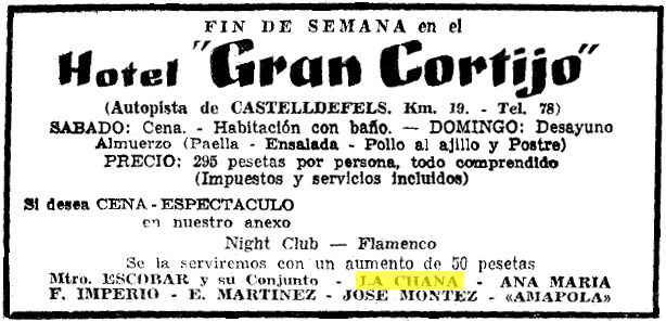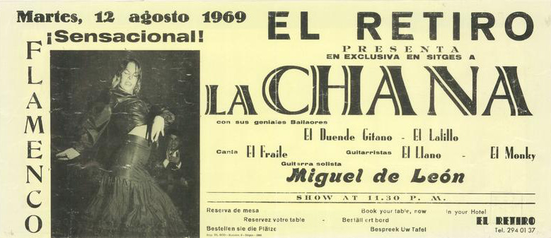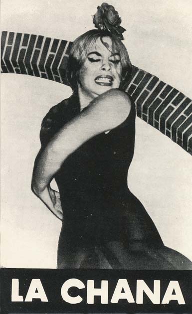 «Los Tarantos, después de ofrecer las actuaciones de las más grandes bailaoras de flamenco: María Márquez, Curra Jiménez, La Singla, Maruja Garrido, presenta, tras el gran éxito conseguido en Madrid a la sensacional LA CHANA.»
