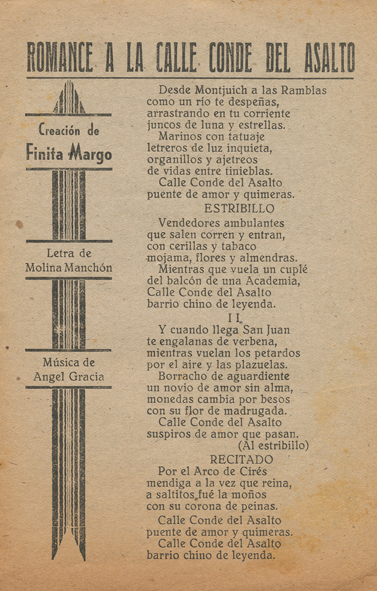 Y, por último, también un tango dedicado a la calle Conde del Asalto, letra de Rossend Llurba y música de Rafael Iriarte (Rafael Yorio), cito de la web Hermanotango: