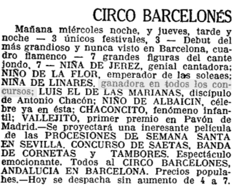 La primera vez que vino a Barcelona, en 1927, ya fue anunciada como «ganadora en todos los concursos», dando a entender la fama de buena cantaora que le precedía.