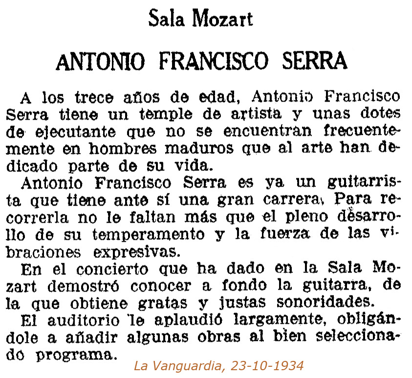 Antonio Francisco Serra (Vilafranca del Penedés, 1921 – Barcelona, 2002*) fue un concertista y profesor de guitarra muy apreciado y reconocido en Barcelona durante el último tercio del siglo XX. Aunque pocos se acuerden de él en la actualidad, Serra fue el maestro tanto de los concertistas y pedagogos flamencos Andrés Batista y Manuel Granados como del guitarrista clásico y también profesor Juan Mario Cuéllar. El maestro Serra empezó los estudios de guitarra a los 7 años con su padre. Fue alumno aventajado tanto de Miquel Llobet como de Emili Pujol y Francisco Alfonso, en el Conservatorio Municipal de Barcelona. Debutó en la Sala Mozart en 1934, cosechando muy buenas críticas: