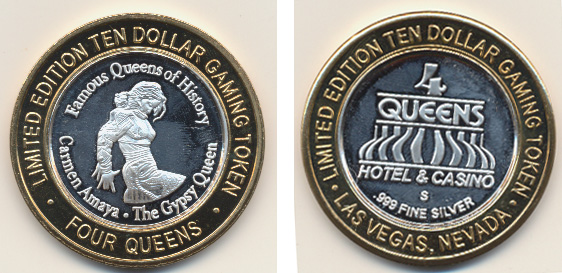 Pues, evidentemente, porque la consideran una de las reinas de la historia, de hecho, la famosa reina gitana, así reza la inscripción en la moneda (Famous Queens of History. The Gypsy Queen). El Four Queens suele hacer silver strikes de reinas famosas (como la Reina de Corazones) o de cosas o eventos que tengan 4 caracterizaciones (los palos de una baraja, las 4 estaciones, etc) o, simplemente, eventos de interés. Queda claro que la fama de Carmen Amaya como bailarina gitana en Estados Unidos sigue vigente.