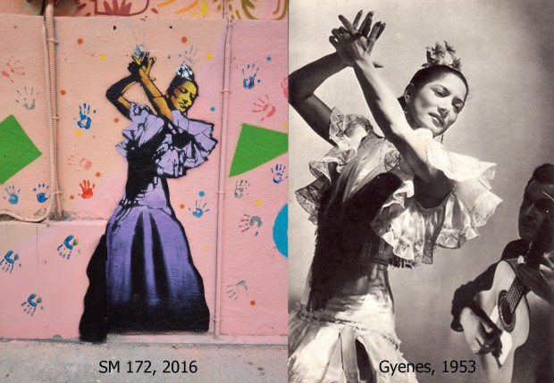 El artista que ha pintado a Carmen Amaya, el Pescaílla, Gato Pérez y los Castellers es SM 172 y utiliza la técnica del stencil art (o plantillas). Este es el bonito resultado: