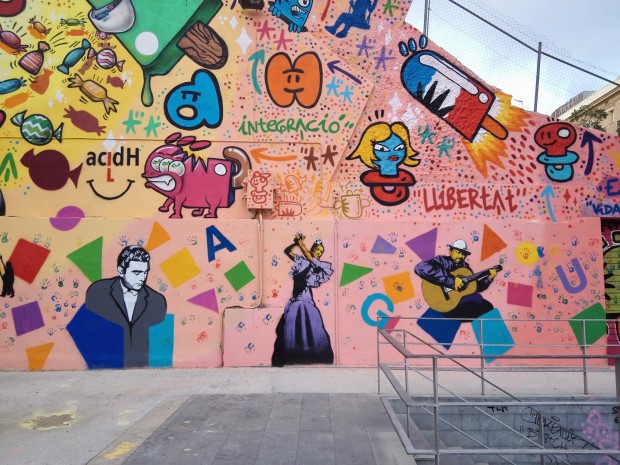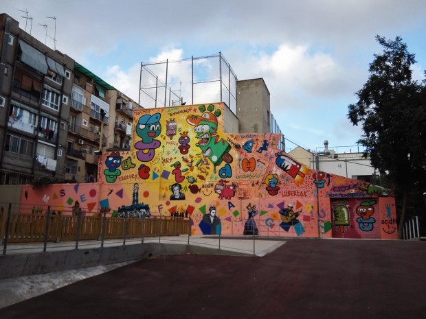 Al final del verano conseguí contactar con Ricardo Valentí, presidente y alma máter de la Associació Joves Gitanos de Gràcia, que me puso sobre la pista de los autores del mural. Ricardo, muy amablemente, me hizo de cicerone por el barrio y me explicó el origen de la transformación del mural de la plaza, antaño lleno de pintadas muy poco artísticas. En colaboración con entidades representativas del barrio y el Ayuntamiento de Barcelona se decidió contratar a tres grafiteros de renombre en Barcelona para transformar todo el mural de la plaza. Las entidades que colaboraron fueron: la Associació Joves Gitanos de Gràcia, la Asociación Catalana de Integración y Desarrollo Humano (ACIDH), la Asociación de Familias (AFA) de la escuela de primaria Univers, la escuela de vida Montserrat, el Club de Petanca Casal d’Avis Siracusa y el Distrito de Gràcia. Los famosos profesionales del street art fueron (gracias a la ayuda de Uriginal para identificarlos) el Xupet Negre, SM172 (Caesar Baetulo) y Konair.