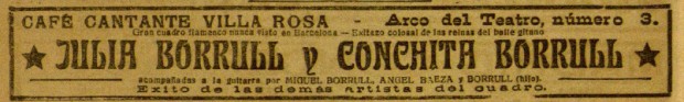Arco del Teatro, número 3. Gran cuadro flamenco nunca visto en Barcelona. Éxito colosal de la reina del baile gitano Julia Borrull. Acompañada a la guitarra por Miguel Borrull (padre e hijo). Éxito de las demás artistas del cuadro.