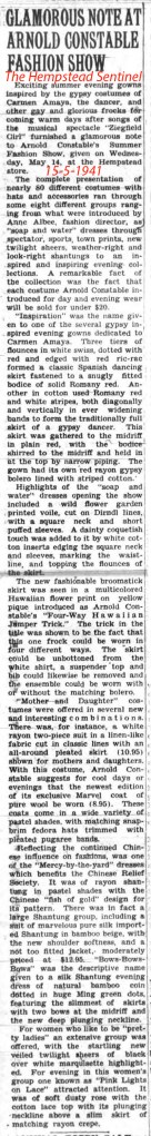 Carmen Amaya llegó a Nueva York el 9 de diciembre de 1940 y en pocas semanas pasó de actuar en un modesto cabaret como el Beachcomber a ser contratada por el mánager de estrellas Sol Hurok para bailar en las mejores salas de concierto de todo Estados Unidos. Debutó en el Beachcomber el 17 de enero de 1941, en febrero actuó en un espectáculo benéfico para las corresponsales femeninas en la guerra (delante de Eleonor Roosevelt), grabó el corto documental Original Gypsy Dances, en marzo Gyon Mili le hizo un magnífico reportaje fotográfico para la revista LIFE que llegó a exponerse en el MOMA (en enero de 1942) y en junio grabó junto a su familia en la discográfica DECCA los dos volúmenes de Flamencan Song and Dances I y II . Junto a toda esta actividad, los grandes almacenes Arnold Constable de la Quinta Avenida organizaron un desfile veraniego el 14 de mayo en el que se pudieron ver algunos vestidos de noche inspirados en Carmen Amaya. “Inspiration” se llamaba uno de ellos.