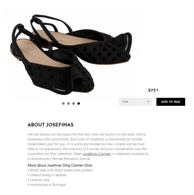 Podemos seguir nuestro atrezzo amayil con unos zapatos de la marca portuguesa Josefinas, que parecen de muy buena factura y calidad. Hay zapato plano y botines. Por la friolera de 275 euros en 2019.