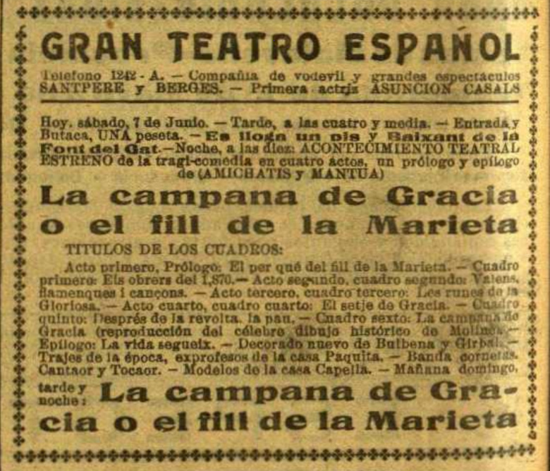 El Teatro Español, inicialmente conocido como el Circo Español Modelo, es considerado el primer teatro del Paralelo, la famosa avenida barcelonesa que durante el primer tercio del siglo XX se convirtió en el epicentro de la actividad teatral. Desde 1921 el reconocido actor Josep Santpere empezó a estrenar sus obras allí, de tipo vodevil. De entre todas las obras que produjeron los actores Josep Bergés y Josep Santpere hay solo una en la que cuadran todos los datos aportados por Carmen Amaya. Se trata de «La Campana de Gracia o el Fill de la Marieta», secuela de la tan coreada «Baixant de la Font del Gat».