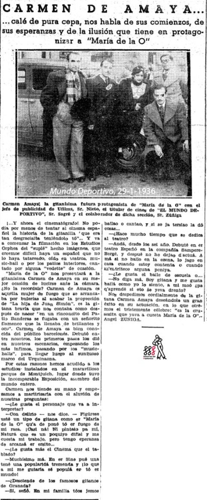 El hilo que yo he seguido para encontrar el debut en las tablas de Carmen Amaya lo inicié con la entrevista que le hizo Ángel Zúñiga en enero de 1936, con motivo de su estreno como protagonista en la película María de la O.
