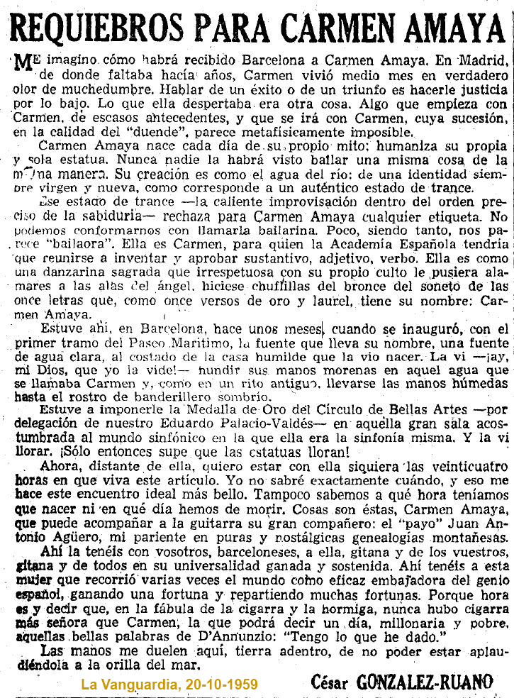César González-Ruano le dedicó un sentido artículo en La Vanguardia el 20 de octubre de 1959: